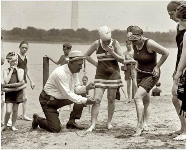 Olha o fiscal em ação, medindo o comprimento das roupas de banho das moçoilas.