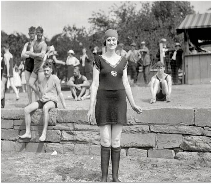 Tanto aqui como lá, ir à praia era um programão, mas com o devido recato nas roupas de banho: