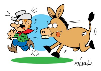 Cor de burro quando foge. O correto é: Corro de burro quando foge! Esse foi o pior de todos! O sentido é que, quando o burro dispara, não se sabe para que lado ele vai, então é melhor sair da frente!