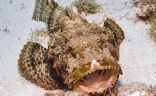É o peixe mais venenoso do mundo. Segundo os cientistas, a dor mais forte do planeta é causada por ele, que vive em águas rasas e pode ser confundido com pedras e corais – e pode ser pisado. Aí literalmente é onde mora o perigo, porque o peixe-pedra tem cerca de 13 espinhos venenosos alinhados na região dorsal. Quando uma pessoa pisa no peixe-pedra. é injetada uma grande quantidade de veneno que causa uma dor intensa e agonizante, e se o ferimento causado pelos espinhos do peixe for muito profundo, o veneno pode causar choque, delírios, paralisia e a morte de tecidos. O que se tem que fazer imediatamente é procurar ajuda médica!