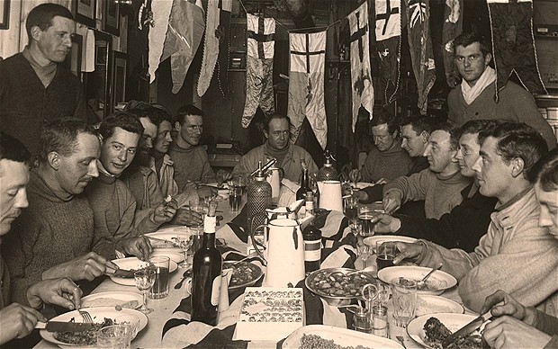 Scott, na ponta da mesa, celebra seu aniversário no navio que o levou até o Polo, seis meses antes de sua jornada no gelo.