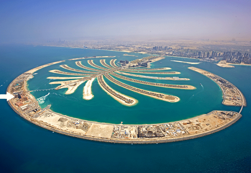 Não sei se você vai conseguir localizar, mas se olhar a foto acima com atenção, bem na frente do topo da palmeira, vai ver uma “pontezinha” branca, esse é o monotrilho que também liga Dubai ao Atlantis – aquela construção cor de tijolo que se vê marcada na foto com uma seta branca. (uma curiosidade: um apartamento de 550 m2 no tronco da palmeira, segundo andar, de frente para o mar, 4 dormitórios, 5 vagas na garagem… custa em torno de um milhão e meio de dólares…)