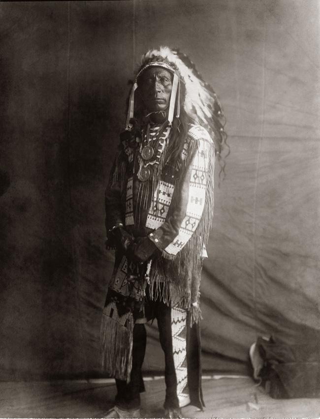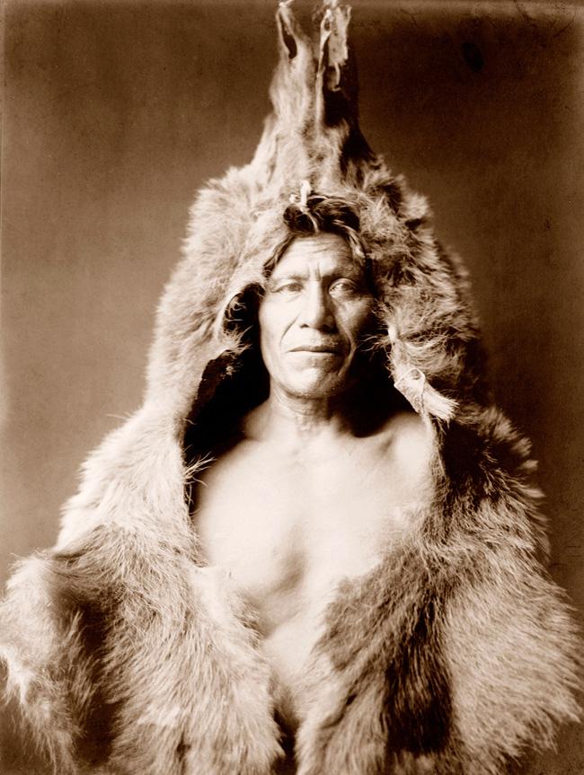 Barriga de Urso, retratado nesta foto, contou a Curtis como conseguiu seu nome e também a pele de urso que usava: “Subi num rochedo. Lá embaixo, avistei três ursos. Esperei até que o segundo estivesse junto ao primeiro e disparei minha arma. O urso mais distante caiu, a bala atravessara o corpo do primeiro para se alojar no crânio do segundo. O primeiro, apesar de ferido, investiu contra mim, e eu disparei novamente, rompendo-lhe a espinha dorsal. Um ruído me fez lembrar do terceiro urso: ele corria rosnando e estava a apenas 6 passos de mim. Quando disparei, o cano do fuzil tocava o seu peito, e o matei. Aquele com a espinha quebrada se arrastava ainda. Eu me aproximei e lhe disse: ‘Vim para te encontrar, meu caro amigo, para te manter sempre comigo’. E atirei nele mais uma vez”.