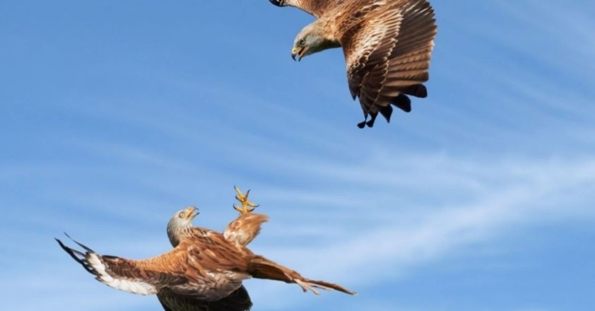 Mas os desentendimentos também ocorrem nos céus. Essas duas aves de rapina se enfrentam em Oxfordshire, na Inglaterra. Não se soube o motivo…
