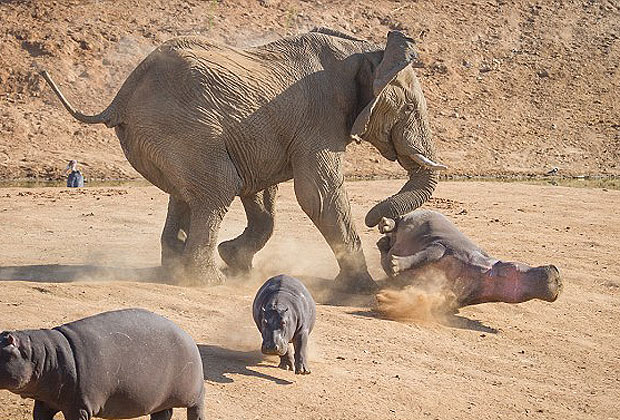 Briga de pesos-pesados: nesta foto tirada na Namíbia, a mamãe hipopótamo foi salvar o filhote, que estava sofrendo bullying do elefante, e tomou um “ippon” do grandão. Mas essa distração ajudou o filhote a fugir e ela, depois, foi ter com ele sem grandes ferimentos. Parece que apenas sua dignidade foi ferida.