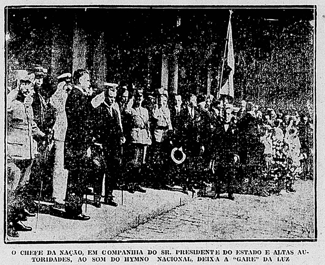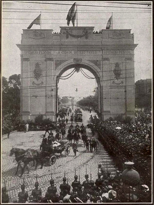Ao chegar a Estação da Luz, Epitácio Pessoa foi recebido pelo então Presidente do Estado, Washington Luís, e pelo prefeito do município, Firmiano Pinto. Após a execução do hino nacional e das demais recepções de chegada, partiu a delegação rumo ao Palacete Prates. Abaixo, o momento em que o landau presidencial acabava de passar sob o Arco do Triunfo.