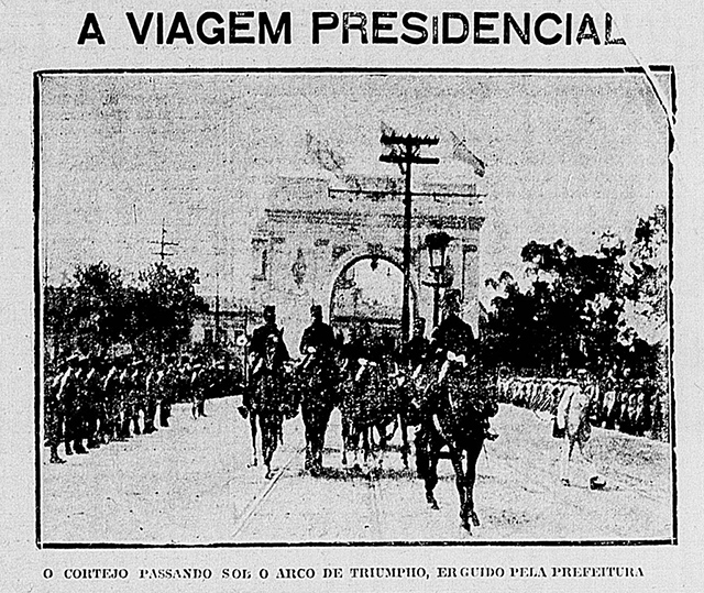 Ao aproximar-se da região central de São Paulo, já na então Estação do Brás, o comboio presidencial foi obrigado a parar por longos minutos. Todos os operários das fábricas que margeavam a ferrovia naquela região foram até os trilhos para saudar o presidente. Só depois a delegação seguiu até a Estação da Luz, onde as autoridades municipais e estaduais aguardavam. E é aqui que começaremos a falar do Arco do Triunfo.
