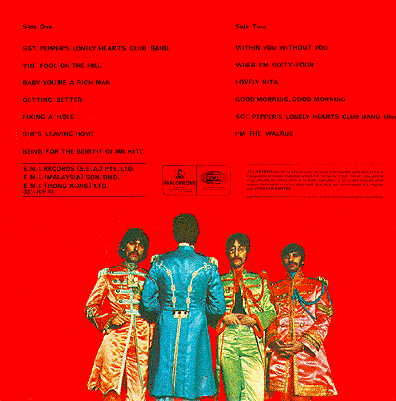 - O encarte foi também uma sacada inovadora. Além de imprimir as letras das músicas (o primeiro álbum a trazer isso), outra ideia foi incluir um envelope com diversos decalques auto-colantes e tatuagens que colassem na pele com uma lambida. Elementos que remeteriam à infância, quando essas coisas eram dadas na compra de um chiclete ou revista em quadrinhos. Mas a gravadora EMI reclamou muito da despesa extra e da impraticabilidade de toda a ideia. Assim, o meio termo se tornou o encarte. Em um fundo verde de papelão, você teria a opção de recortar, se quisesse, uma medalhinha, um bigode do Sgt. Pepper e o colorido bumbo da banda. O painel também incluía um desenho do Sargento, baseando-se no rosto de um busto que existia no jardim de John e que foi usado na foto da capa (claro que recortei tudo quando comprei minha cópia…)