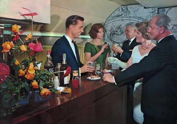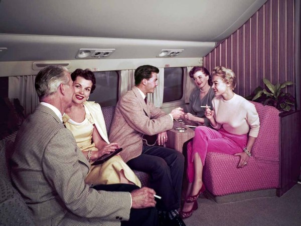 Você pode ter notado, na foto lá em cima no bar, uma moça com o cigarro na mão. Fumar, hábito banido nos aviões há muitos anos, era então permitido e os passageiros costumavam se reunir na sala de estar para fumar e conversar durante o voo.