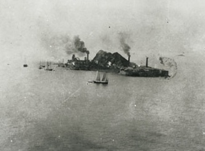 Em 1890, durante a industrialização do Japão, a Mitsubishi comprou a ilha de Hashima e começou o projeto de extração de carvão em minas submarítimas. No local foi construído o primeiro edifício de concreto de largas proporções do Japão, um bloco de apartamentos concluído em 1916 para acomodar a cada vez mais crescente massa de trabalhadores.