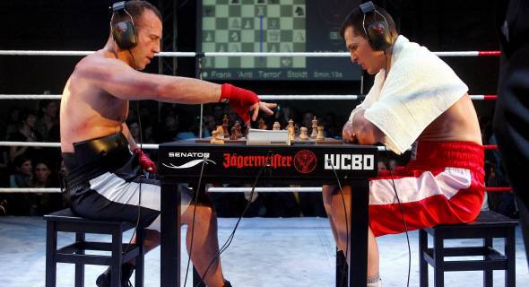 Isso mesmo que você leu. Os lutadores se enfrentam no ringue em dois rounds de dois minutos cada, e depois jogam xadrez por quatro minutos e assim por diante, até um nocautear o outro ou dar um xeque-mate. Vou sugerir um MMA-dominó, que tal?