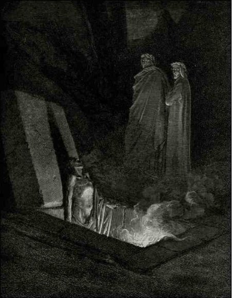 Sexto círculo – Cemitério de Fogo, lugar dos que em vida foram hereges, os que não acreditaram na existência de Deus e de Jesus como seu Filho. A punição que eles recebem é o sepultamento em túmulos abertos, de onde sai fogo (o que nos lembra a sentença dada aos condenados por heresia pela Igreja, que eram queimados em fogueiras).
