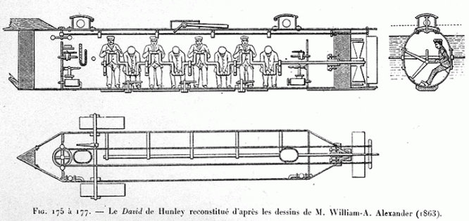 Durante a Guerra Civil Americana (1861-1865), os estados do norte, que defendiam a união do país, bloquearam as costas do sul confederado, que lutava pela secessão dos estados escravocratas. Para fazer frente ao poderio da marinha da União, os confederados construíram o primeiro submarino que teve de fato um uso prático, o Hunley, pequeno e movido a manivelas acionadas por sete marinheiros.