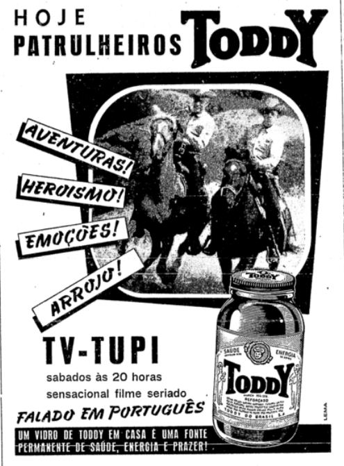 A série era “Tales of the Texas Rangers” e exibida na TV americana entre 1955 e 1958. Aqui, a série virou uma febre e, aproveitando-se do momento, o patrocinador passou a promover o sorteio de um uniforme completo de Patrulheiro Toddy. Basta para isso enviar o rótulo da embalagem de Toddy com nome, endereços, etc. E já viu, o sonho de todo moleque em 1961 era ganhar esse uniforme!