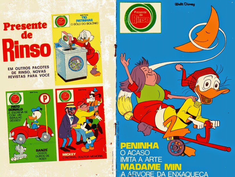 O sabão em pó Rinso foi o primeiro a ser fabricado no Brasil, em 1953, pela Unilever. Era o dono do famoso slogan “Rinso lava mais branco”, e já não é mais fabricado, tendo sido substituído pelo OMO. Mas ele lançou uma promoção muito interessante em 1971: uma coleção de 4 revistas de quadrinhos Disney, produzidas pela Abril. As revistas vinham embaladas em um plástico coladas no verso da caixa do sabão, e dava pra ver a revista antes de comprar o produto, evitando de comprar repetida.