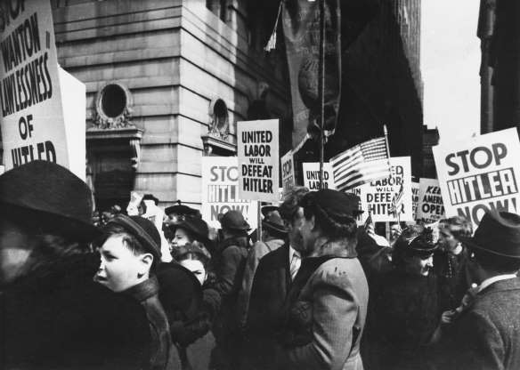 Manifestação pró-Hitler em Berlim, 1941.Avião de guerra alemão Heinkel He-111 em ataque às tropas inimigas, em 1941.Navios americanos em chamas na base de Pearl Harbor, atacados pelo Japão em 1941.Submarino alemão no círculo polar ártico, em 1942.