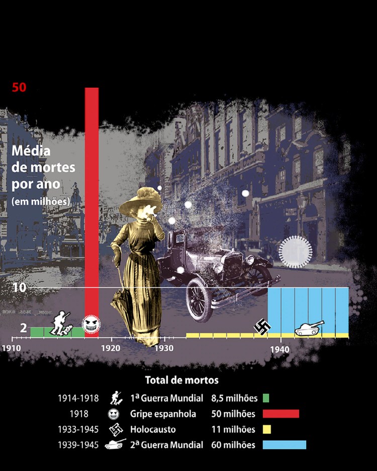 No mês seguinte, o país inteiro já está submerso naquela que foi a mais devastadora pandemia do século XX, matando mais de 50 milhões de pessoas em todo o mundo.
