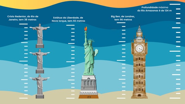 O rio Amazonas chega a atingir uma largura de 11 km, o que o torna o mais largo do mundo. Ele é responsável por 20% de toda a água doce que chega aos oceanos. A maior profundidade registrada em toda sua dimensão é de 124 m, mais profundo do que a altura de três estátuas do Cristo Redentor, uma Estátua da Liberadade e um Big Ben.